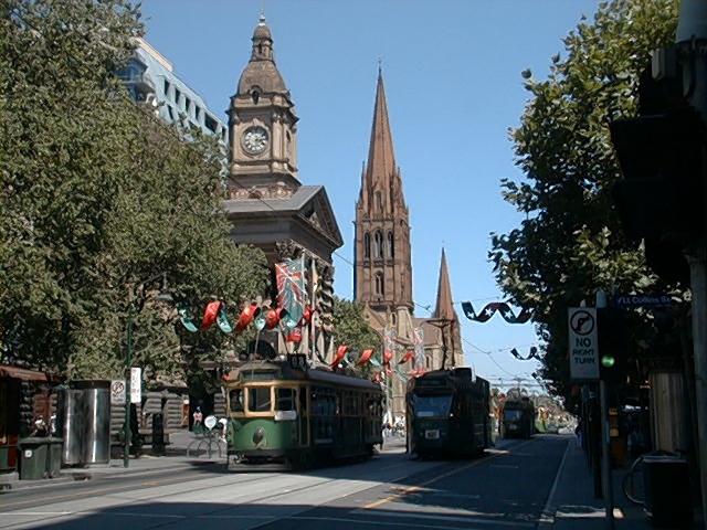 Another look at downtown Melbourne, you can see the old City Hall and an old Church.